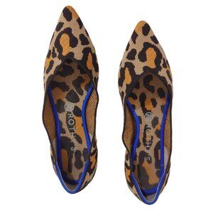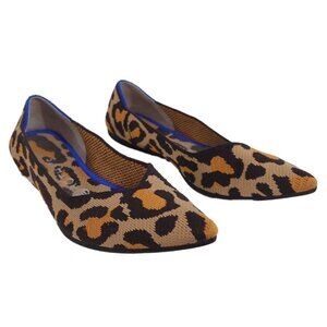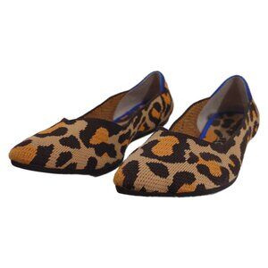 These pointed-toe flats by Rothy's feature a warm beige and dark brown Big Cat leopard print and combine exceptional comfort with versatile, washable style.