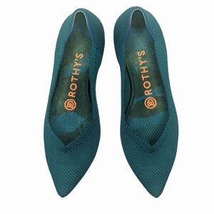 Pre-owned. Rothy's The Point in deep teal with camo insole. From website: "Bring on the bright with this gem-hued pick that's finished with cool camo insoles. Woodland inspired patterns meet splashy hues and intricate stitching." Clean with no notable wear.