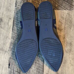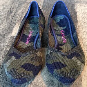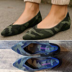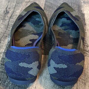 These are Rothy’s The Point shoes in Spruce Camo. They are in excellent condition. They are a size 8. Sleek pointed-toe flats with soft flexible knit upper, rubber outsole, machine washable.