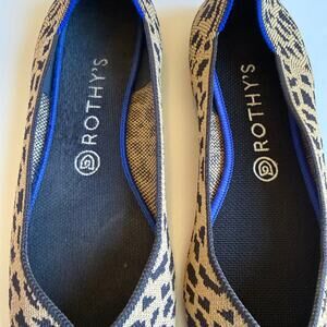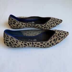 Size 10.5 Women's slip-on Rothy's leopard print ballet flat shoes. Light brown and dark brown leopard print with pointed toe. Made from recycled bottles! Such a neat shoe company! The insoles are removable and washable. Very light wear. Very good used condition.
