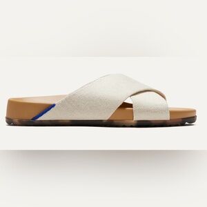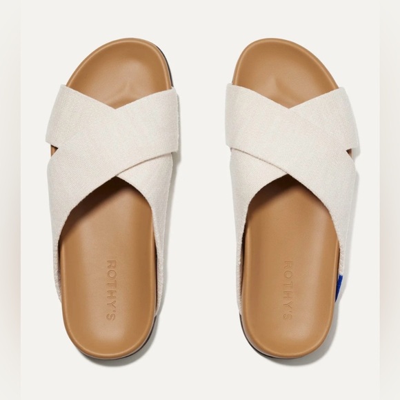 Flexible upper knit with natural, breathable hemp and features two wide crossing straps in cream.