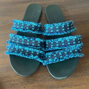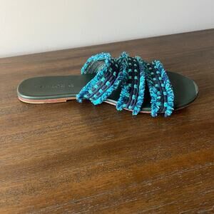 Rothy’s Woman’s Teal Blue Print Slip On Fringe Triple Band Sandal- Size 8.5