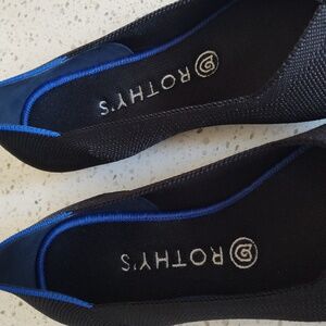 Rothy's casual, everyday wear black flats with a striking blue trim. Perfect blend of comfort and style. In excellent condition. Size 8.5. Non-smoking home. No original packaging. Bundle for an automatic discount.