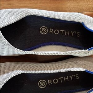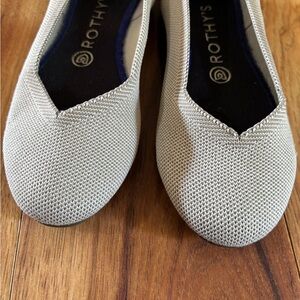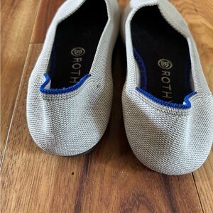 Rothy’s stylish cream flats with a touch of blue. Perfect for everyday wear. Comfortable and chic design. Like New