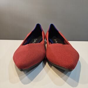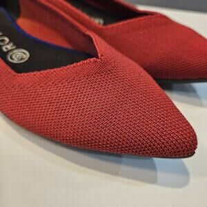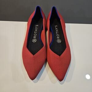 The product is a pair of women's pointed toe flats in red, featuring a slip-on closure and a lightweight, comfortable design. Made by Rothy's, these flats are crafted from recycled textile material and recycled rubber outsole, making them a sustainable and eco-friendly choice. Suitable for various occasions such as travel, parties, casual outings, and business meetings, these flats are perfect for year-round wear and are a stylish addition to any woman's shoe collection. With a focus on comfort and breathability, these red flats are a practical and fashionable choice for any woman looking for a versatile footwear option.