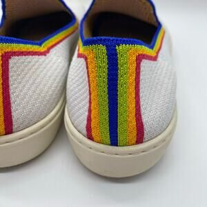 Step into style with these Rothy's slip-on shoes! Featuring a playful rainbow design on a clean white background, these shoes are perfect for adding a pop of color to any casual outfit.