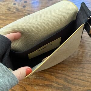 Rothy’s tan navy blue knit the saddle bag crossbody minimalist purse bag