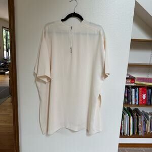 Crepe crewneck top with side slits. Sleeves fall to elbow. Square shape. Drop sleeve. Blind hem at sleeve and bottom opening. Pulls on overhead. Silver zipper with grosgrain zipper pull. Seasonless style designed to dress up or down. Be artful be comfortable.