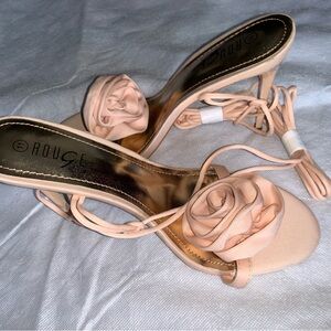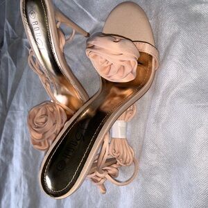 Stylish blush pink heels with floral accents. Ideal for chic events. Low heel and comfortable material. Brand New! Never worn. NEED GONE ASAP
