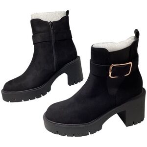Chic black boots with a chunky heel. Features a striking gold buckle. Ideal for a stylish look. New with tags. Size 9.