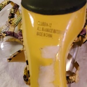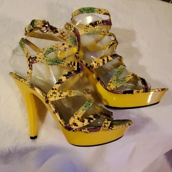 Great used condition! Little to no wear. Yellow, purple, green & black with faux reptile/snake skin pattern. 5" heels.