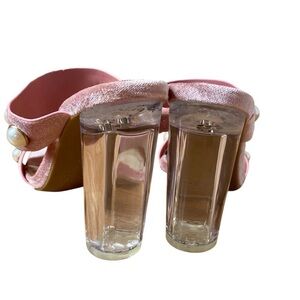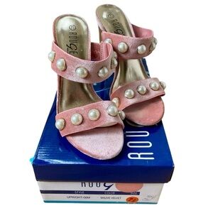 New in Box Never Worn Rouge Upright Pink Mauve Velvet Strap with Pearl accents and a Clear Lucite Block 4” Heel. Women’s Size 7.5.