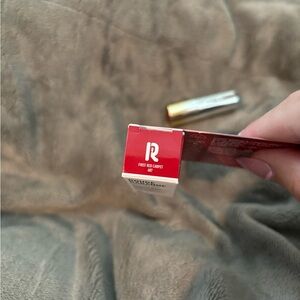 Rouge Rabanne Dramalips lipstick in a sleek silver case. Vibrant red packaging.
