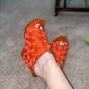 Rouge Women's Orange 3D Floral Platform Peep Toe wedge mules size 10