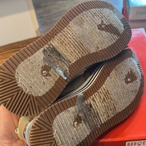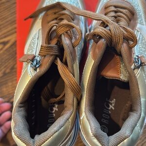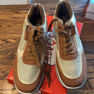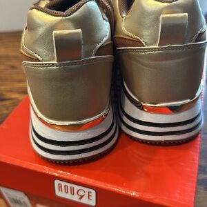 Rouge! gold metallic sparkle stacked black & white stripe sole faux leather blocked zipper & tie sneakers. Heel gold mirror accent. Left inner has a blemish where it looks like construction glue landed- see last pic. Otherwise, excellent condition. Size 8.5. Priced accordingly. Includes box. Nonsmoking home.