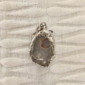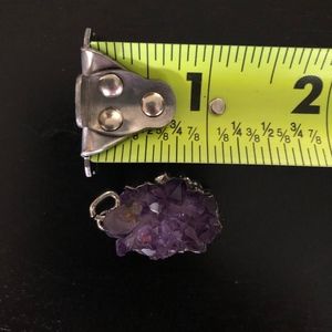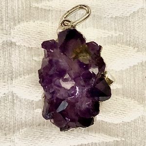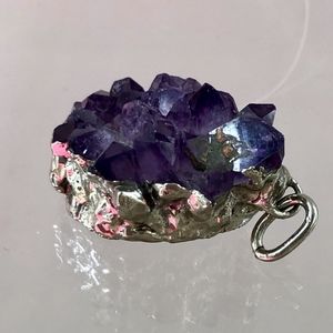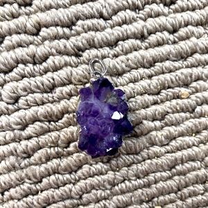 Stunning, organic rough amethyst geode pendant deep set in Sterling Silver. Beautiful rough amethyst gemstone piece with chunky natural crystals & gorgeous deep violet color. Pendant has 1" drop. No chain included.
