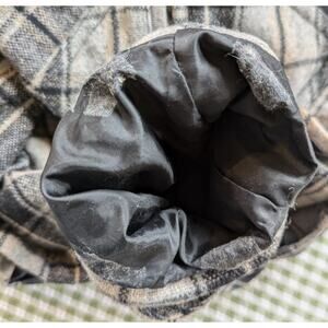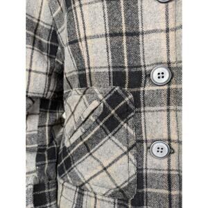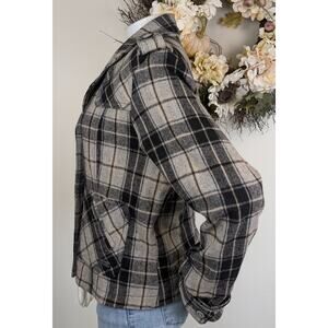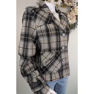 Wool blend plaid jacket by Rough Hewn in a versatile gray black tan check. Short moto peacoat silhouette with a button front, notched collar, flap pockets, and a slightly cropped, structured fit that pairs well with denim or dresses. Cozy mid-weight layer for fall and winter with timeless heritage vibes. Pre-owned.