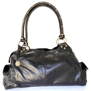 Rough Roses New Genuine Soft Black Leather Large Satchel Bag, Bright Gold Detail