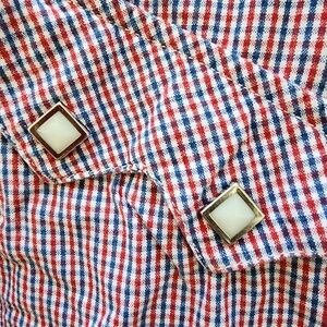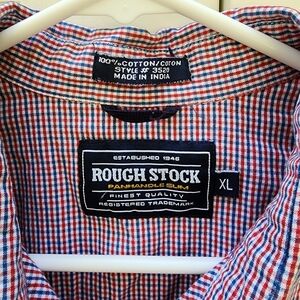 This Rough Stock by Panhandle Slim western shirt is a classic staple for any cowboy or western wear enthusiast. Size XL. Features a red and blue plaid pattern, pearlized square snap buttons, front and back yoke, and double chest pockets with flap and snap closures. Excellent for rodeo events, line dancing, or casual western style. Lightweight cotton blend. In great pre-owned condition with minor wrinkling but no stains or holes. perfect colors for 4th of July party!
