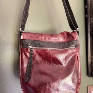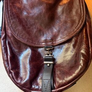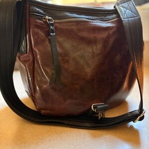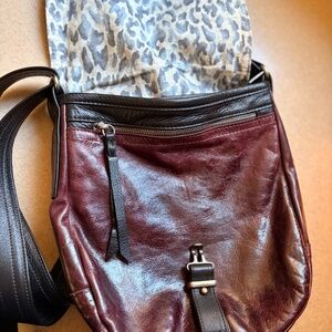 Black cherry leather with black leather strap, tabs, binding and zipper pulls.