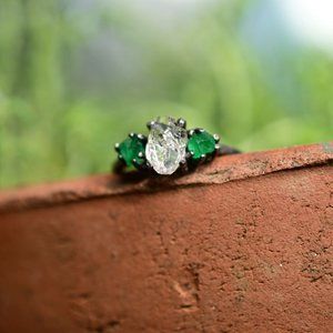 Embrace uniqueness with this OOAK ring featuring two raw emeralds and one Lake County diamond in sterling silver.