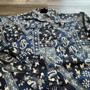 Roughrider By Circle Paisley Horses Pearl Snap Blue White Women's Size Small Western Button Up Shirt long sleeve collared curved hem all over print casual rodeo western heritage americana