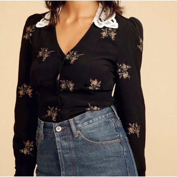 Elegant black blouse with floral pattern. Features a white collar. Perfect for any occasion.