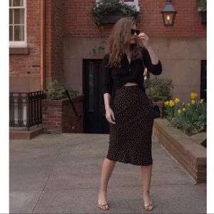 Rouje Paris Carina Skirt. Color: Black with copper/tan polka dots. Size: EU 34. Invisible size zipper with tie waist. 100% rayon.