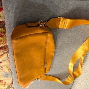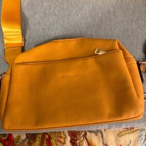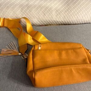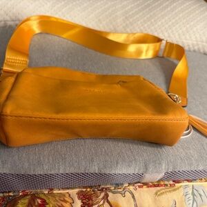 This bag can be worn on your shoulder, or crossbody and it has a top zipper closure. It has a zipper hanging from the zipper and it is gold in color. There is a pocket on the front of the bag and a pocket on the rear of the bag. There is a pocket in the inside of bag. The bag is 10 inches wide and 7 inches long.