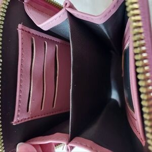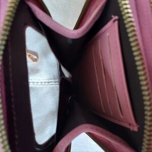 Roulens over the shoulder or clutch wallet. Pink with gold embellishments. Never used. Holds phone, credit cards cash.