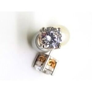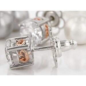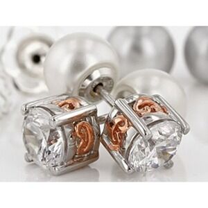 The Elle Cross gray and white pearl simulant and white diamond simulant 3.84ctw round, rhodium over sterling silver, and Eterno (TM) 18k rose gold over sterling silver stud earrings. Measures approximately 1/4"L x 1/4"W and has tension post backings. This pair of earrings can be worn in two different ways. The diamond equivalent weight is 2.06ctw. Hyproallergenic posts.