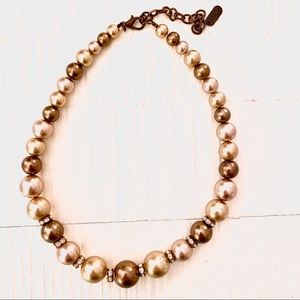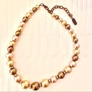 These beautiful faux pearls are in shades of brown, tan, and cream. There are pave rhinestone spacers between the pearls. Adjustable length through the bronze-colored extender chain.