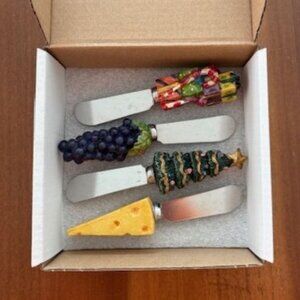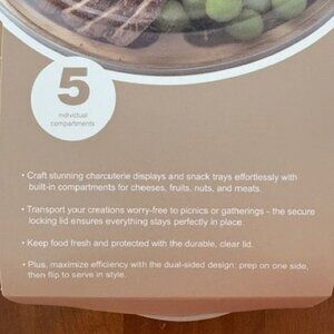 This very nice bamboo charcuterie board has five compartments and a plastic lid that locks securely in place for transporting. You can use the reverse side of the tray as a cutting board. This comes with a set of 4 festive serving knives for spreadable cheese, etc. The knives have decorative handles that include a Christmas tree, a stack of gifts, grapes, and a brick of cheese.