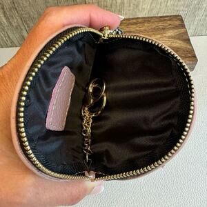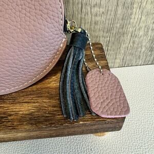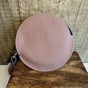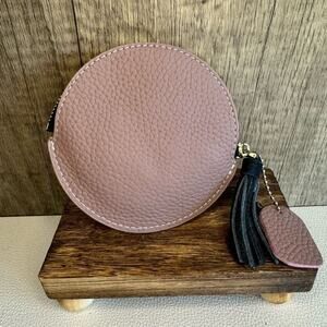 This is a cute round coin purse wallet. It is leather. It’s got a really nice tassel on the zipper, and inside it is lined and has a keychain if you want to keep keys in it.