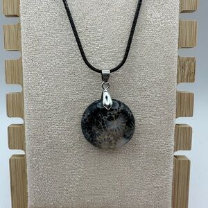 Beautiful round coral fossil jade pendant on 16” black stainless steel chain with 2” extender and lobster clasp closure. Pendant is on a silver copper bail. Pendant had gorgeous clear natural flower fossil patterns in black and white.