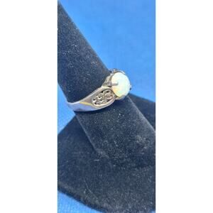 Round Cut Pearl White Opal Ring- 925 Sterling Silver- 7.75