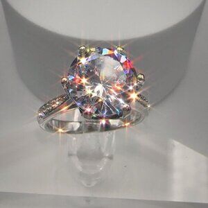Round Cut Simulated Diamond Engagement Ring With Pave Band In Silver Tone 4CT. This sparkling engagement ring features a round-cut simulated diamond in a classic silver-tone setting, offering timeless elegance and a luxurious look.
