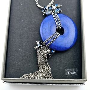 Round Donut Pendant Necklace With Silver Tone Tassel Fringe Chain Dark Hippie