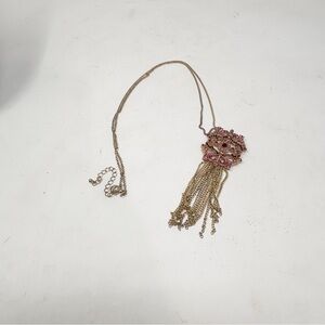 Round Entwined Pink Red Stone Filigree Necklace With Fringe Detail Up To 24”. Good pre-owned condition. See photos. All measurements are approximate.