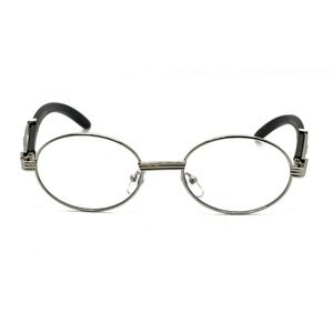 Stylish round eyeglasses offering a blend of classic design and modern functionality. These glasses feature a sleek silver metal frame that provides durability and a refined aesthetic. The clear lenses offer UV400 protection, safeguarding your eyes from harmful sun rays. The temples are accented with a unique wood-like design, adding a touch of sophistication and visual interest. These eyeglasses are perfect for everyday wear, adding a touch of intellectual charm to your professional attire, or complementing a casual weekend outfit.