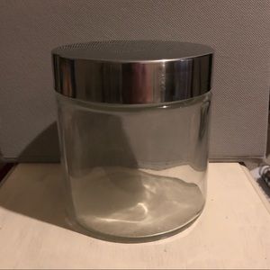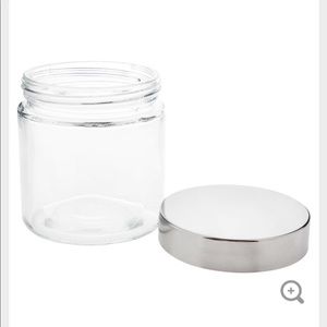 Super sleek round glass jar. This handy jar features a shiny stainless silver metal screw on lid to keep things contained. Never been used. Buy 1 or more to store your stuff. Store sweets, treats, crafts, beauty supplies, beads etc. Embellish it, paint it, etch it and more for a unique personalized touch. Diameter 4 3/8”, Height 4 3/4”, Volume 25 ounces. Food Safe, hand wash only.