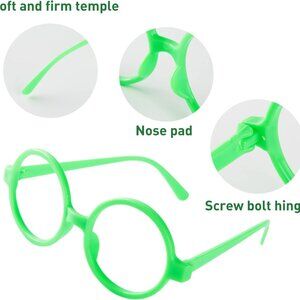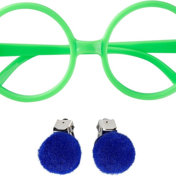Package included: 1 green round frame glasses + 1 pair blue clip-on earrings. Durable: The round plastic green glasses without lenses, made of new ABS plastic, skin-friendly, durable; the earrings are safe and not easily break. Size: One size fits most. Occasion: Perfect for costume accessories, pretend play, dress up, birthday party supplies, Halloween cosplay, Christmas and photography props.