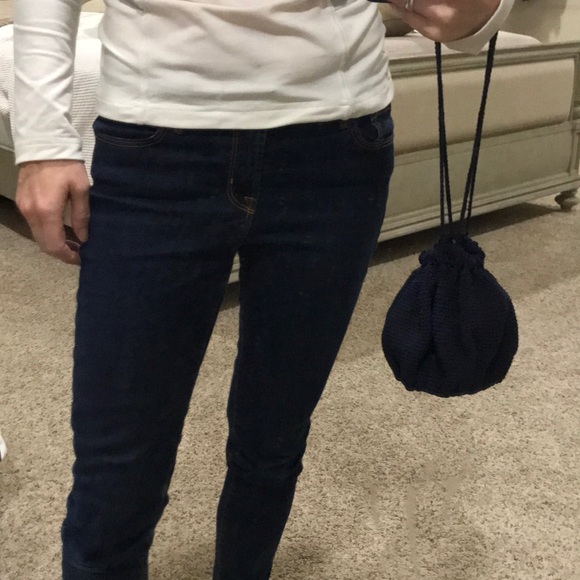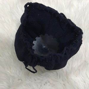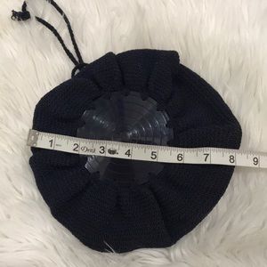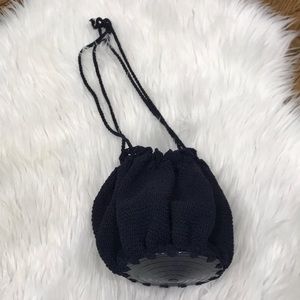 Navy Blue Crochet round bag with plastic bottom. Two drawstrings for carry and closure.