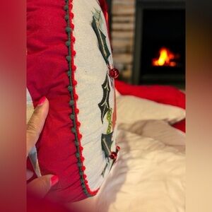 **BEAUTIFUL CHRISTMAS/ HOLIDAY ROUND PILLOW WITH ATTACHED RED JINGLE BELLS & ATTACHED RED BOW! SO FESTIVE AND DECORATIVE!
