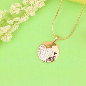 This round pendant features a sparkling heart and engraved “Love” detail, combining elegance and emotion in a polished rose gold finish.
