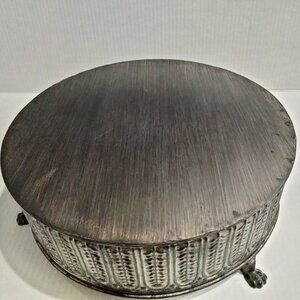 From Creative Co-Op comes this set of two round metal cake/display risers in a silvery/bronze finish, featuring an embossed design all around the sides and a smooth finish on the top of each one. Standing on small feet, the large riser measures 11.5 inches in diameter, and the small one measures 8 inches in diameter. Perfect for cakes or desserts or for showcasing any special presentation, they can be used together in tiered fashion, as shown in the pictures, or as separate risers. The metal is not food safe, so it is advised to place any food on a separate plate, also shown in the pictures. The glass plates are not included. New and never used, this set will offer a unique display creation at your next party or gathering.
