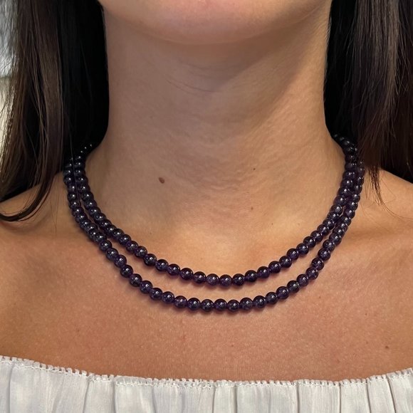 Adorn this gorgeous double strand necklace for an amazing statement look. This necklace features round Amethyst beads, well matched. Handcrafted with perfection. Necklace length: 18 Inches. Total weight 45.95 grams. Great pre-owned condition. Comes with a presentable gift box.