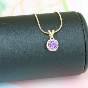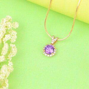 "Round Purple Stone Rose Gold Pendant, XPPT1292 ✔️ Made from gold plated over high quality brass ✔️ Eye-catching round purple center stone ✔️ Pendant size: 0.39 x 0.39 inches (1 x 1 cm) ✔️ Surrounded by shimmering white crystals for extra sparkle ✔️ Lightweight and comfortable for daily or occasional wear ✔️ Elegant and timeless accessory for all outfits ✔️ Ideal gift option for birthdays, anniversaries, or special occasions"