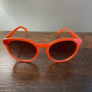 These orange round sunglasses frames are in excellent preowned condition, showing very light surface wear consistent with gentle use. The frame maintains its original shape and vibrant color, and both arms open and close smoothly. The lenses remain clear and free from significant scratches or scuffs. These frames have been lightly cleaned and are ready for use or display.