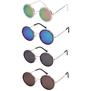 Adorable wire rimmed retro inspired sunglasses. Just in time for festival season, these lovelies will complete that boho look. Four fun colors to choose from! Color options are listed as shown in first photo, from top to bottom. First three photos for styling inspo. Last five photos actual product.